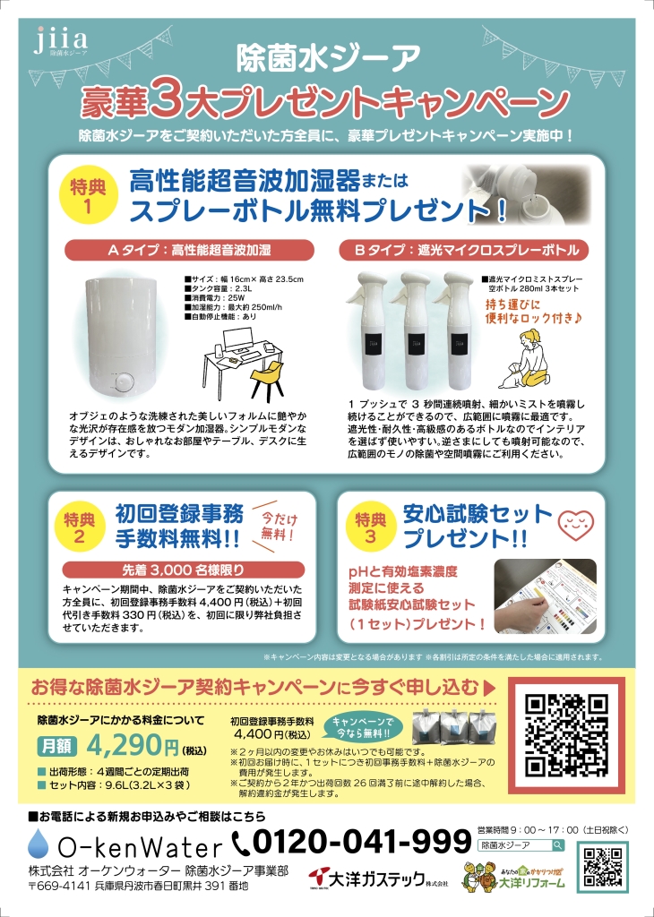 今なら除菌水ジーアをご契約の方もれなく全員に「豪華3大プレゼントキャンペーン」を実施しております!